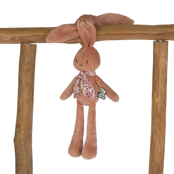 PANTIN LAPIN TERRACOTTA – PETIT Ce joyeux petit lapin aux teintes terracotta a de si longues oreilles, on peut l’accrocher partout pour le garder et ne jamais le perdre. Il peut tout faire avec : le poirier, de la balançoire, s’accroche au fil à linge, et va même jusqu’à se balancer à la lune. Avec ses si longues oreilles, il enveloppe les bébés de tendres câlins et partage des moments de douceur avec eux. Lavable en machine. Présenté dans un joli coffret cadeau personnalisable avec un message dans l’espace disponible sous le couvercle.