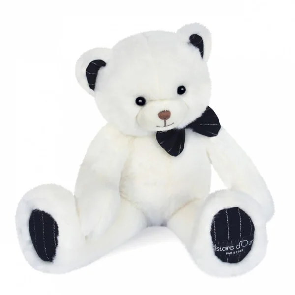 Un bel Ours ivoire particulièrement très chic avec son petit noeud papillon et ses accessoires en joli tissu bleu marine finement rayé par un fil argent. Un joli pantin souple et très doux pour petits et grands, que chacun appréciera pour jouer, cajoler ou décorer la chambre. Présenté dans une belle boîte, c’est un cadeau idéal dès la naissance. Lavage à 30°, séchage naturel ou mécanique à basse température.Ce produit bénéficie de LA GARANTIE DOUDOU. Grâce à son numéro unique, Doudou perdu est vite retrouvé! Enregistrez votre Doudou et découvrez toutes les garanties sur le site doudouetcompagnie.com.