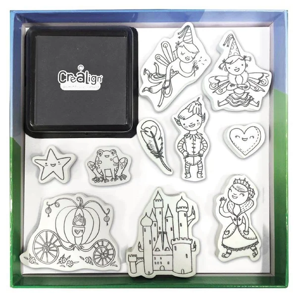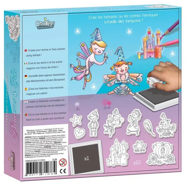 Des personnages à tamponner afin de créer ses histoires ou ses scènes féeriques, pour réaliser ses plus beaux dessins ! Boite de rangement carrée en carton épais contenant 10 tampons et 1 encreur gris (dimension 70 x 70 mm) lavable à l’eau.