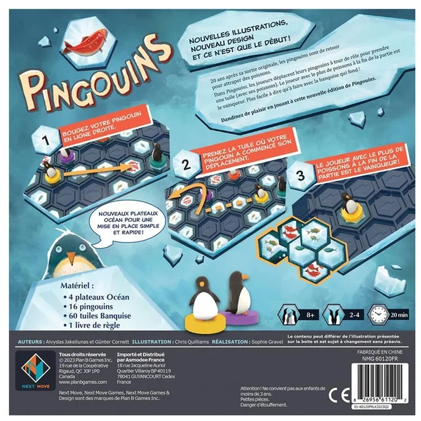 Dans Pingouins, les joueurs doivent attraper autant de poissons que possible avec leurs pingouins. À chaque tour, un joueur déplace un pingouin en ligne droite sur des tuiles de glace en forme d’hexagone avec 1, 2 ou 3 poissons dessus. L’hexagone sur lequel démarre le pingouin est récupéré par le joueur, qui le met dans sa pile de poissons, mais ce faisant, il crée un trou infranchissable sur la banquise. Au fil de la partie, de plus en plus de trous limitent les déplacements. Lorsqu’un pingouin ne peut plus se déplacer, il est retiré du jeu. À la fin de la partie, le joueur ayant le plus de poissons l’emporte. Information : Attention, présence de petits éléments, risque d’étouffement. Ne convient pas aux enfants de moins de 36 mois. FAQ