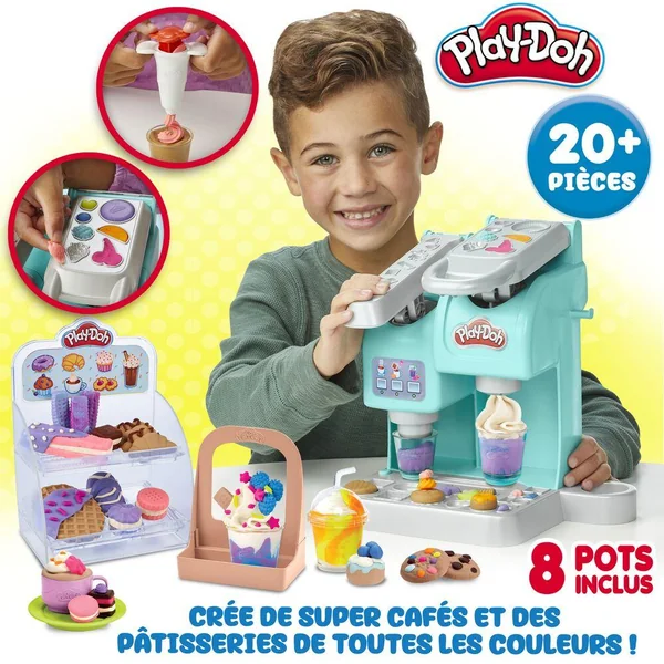 L’imagination est au rendez-vous avec Mon super café de Play-Doh ! Ce café factice permet aux enfants de préparer des boissons Play-Doh créatives à leur façon. On utilise la machine à café Play-Doh pour remplir la tasse et les gobelets de pâte à modeler Play-Doh colorée, puis on les fait tourner et glisser jusqu’au poste de garnitures pour ajouter de la fausse chantilly. On peut créer des pâtisseries Play-Doh colorées à l’aide des moules à cookies, à petits gâteaux et à beignets, puis les exposer sur le présentoir transparent. Qu’ils créent des chocolats chauds, des cafés, des boissons frappées Play-Doh, ou encore des smoothies factices, les enfants peuvent jouer au barista encore et encore. Les jeunes baristas peuvent entre autres créer des cookies, des beignets et des petits gâteaux Play-Doh. On peut ensuite les exposer sur le présentoir qui inclut aussi des moules amovibles pour encore plus de gourmandises – Ce jouet culinaire Play-Doh inclut 2 tasses, 4 gobelets transparents et 2 couvercles transparents pour les boissons chaudes et les boissons frappées. On peut commander ses boissons factices à emporter avec la boîte de transport8 POTS ET 20 ACCESSOIRES : Ce jouet culinaire créatif inclut des pots de 56 g de pâte à modeler Play-Doh classique. Il y a de la pâte rose, marron et blanche, ainsi que des pots de pâte bicolore, dont une pâte violette et bleue (contient du blé) –