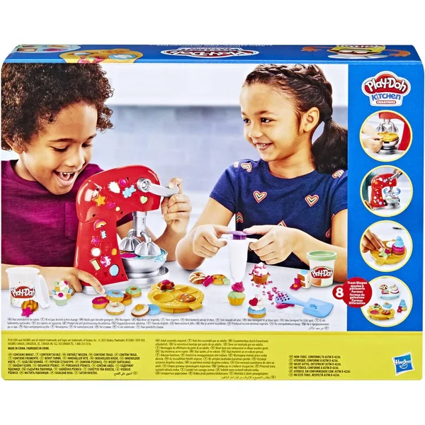 Ils peuvent ajouter des tourbillons de glaçage factice avec l’extrudeur ou la spatule et des vermicelles factices en utilisant les trous sur la poignée de la spatule et créer encore plus de bonbons, de garnitures et de décorations Play-Doh avec les demi-moules sur les côtés du mixeur. Le Robot pâtissier est vendu avec 5 pots de 56 g de pâte à modeler atoxique orange, bleue, rose vif, confetti et bicolore, vert menthe et marron.
