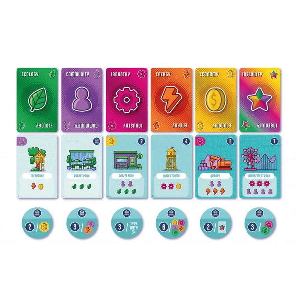 Les règles sont simples : prenez deux cartes adjacentes de la grille de ville et ajoutez-les à votre ville en expansion. Utilisez vos cartes de ressources et vos bonus pour construire des cartes de bâtiment qui nécessitent des combinaisons spécifiques. Construisez des structures civiques spéciales pour multiplier les points de votre ville et devenez le meilleur urbaniste !