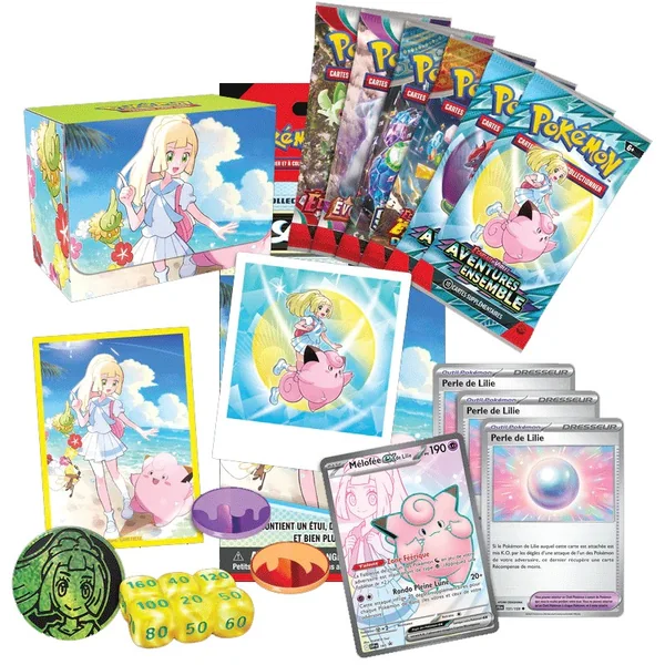 Découvrez le pouvoir de l’amitié avec Lilie ! Courageuse et gentille Dresseuse Pokémon, Lilie puise sa force dans les liens qu’elle entretient avec les Pokémon. En tant que carte promo brillante, Mélofée-ex de Lilie fait pression sur les Pokémon de type Dragon et gagne en force lorsque ses amis sont sur le Banc ! Vous trouverez également trois exemplaires de Perle de Lilie, un Outil Pokémon qui apporte de l’aide aux Pokémon de Lilie, des boosters, un autocollant, des protège-cartes et un étui pour deck illustrés, ainsi que d’autres accessoires pour jouer au JCC Pokémon.