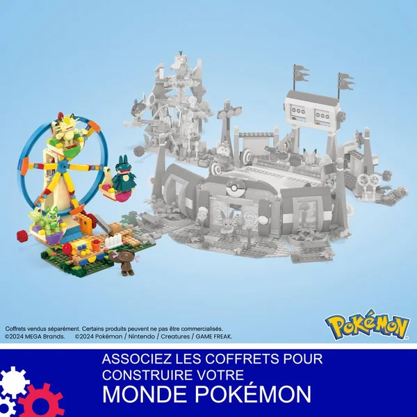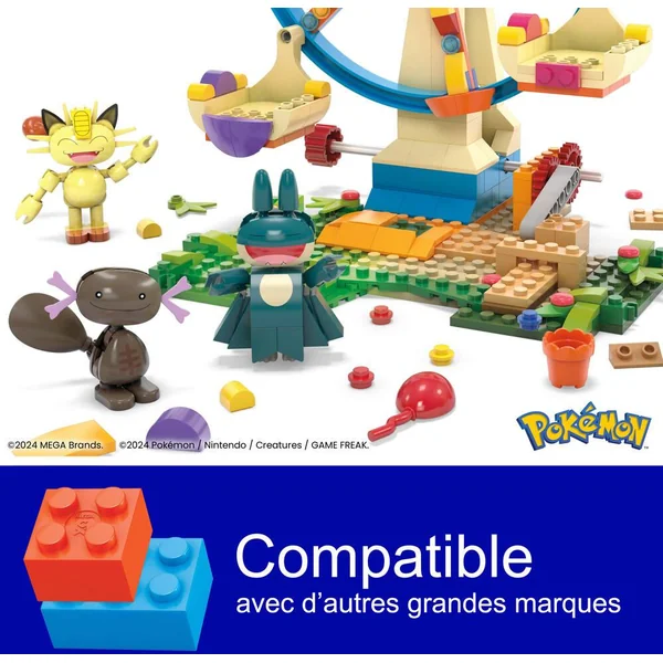 Les pièces sont compatibles avec tous les coffrets de construction MEGA Pokémon et d’autres marques de briques de construction – 400 briques pour construire la grande roue de la fête forraine en « motion brique » avec 4 pokemon : Miaouss, Poussacha, Goinfrex, Axoloto de paldea.