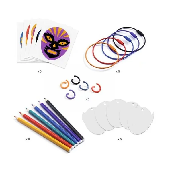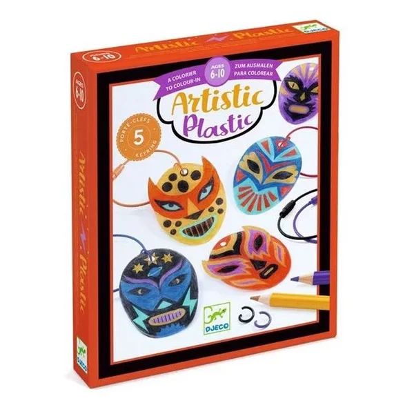 Ce kit propose à l’enfant de créer cinq porte-clefs hauts en couleurs représentant des masques de catcheurs mexicains à partir de plastique rétractable ! Pour cela, il place le modèle sous la silhouette en plastique transparente correspondante et reproduit le modèle avec les crayons de couleur. Une fois passées au four, la magie opère : les pièces rétrécissent en quelques secondes et le plastique devient rigide et épais. Il ne reste qu’à accrocher les réalisations masques aux anneaux colorés pour créer de beaux porte-clefs.