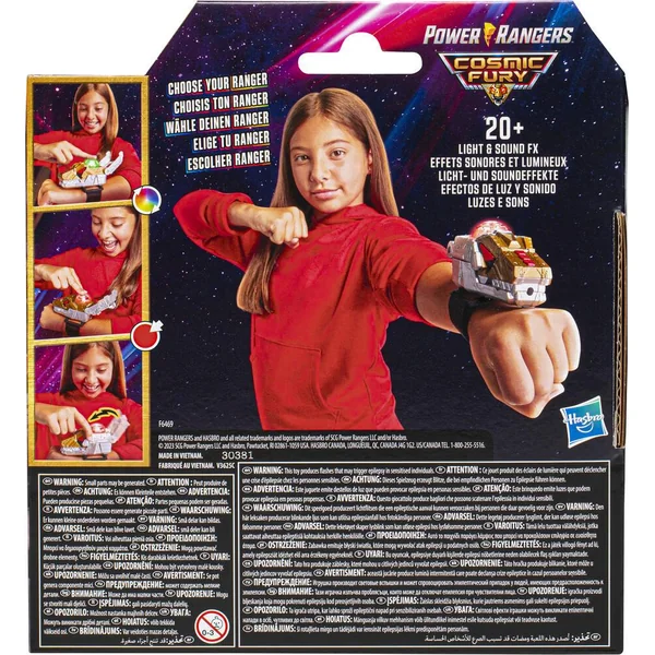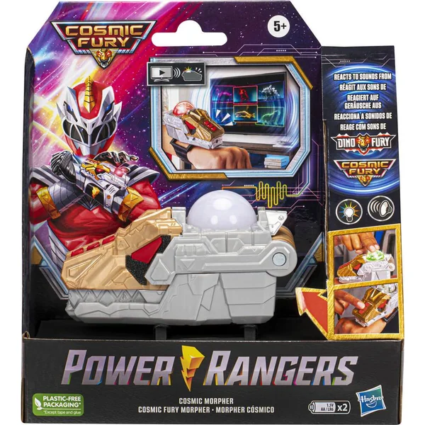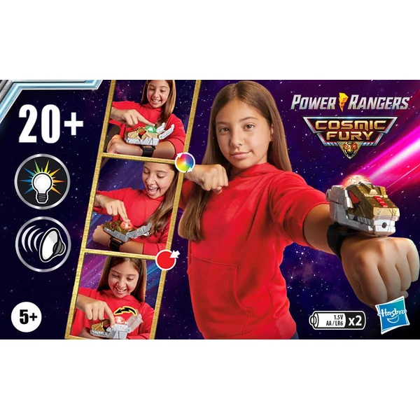 En appuyant sur l’orbe Cosmic Fury au centre du morpher, on peut changer la couleur de du Ranger, choisir son préféré, puis entendre sa voix. En appuyant sur les boutons au-devant du morpher, on peut activer des sons et des lumières de combat . Piles démonstraction fournies.