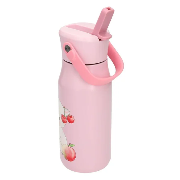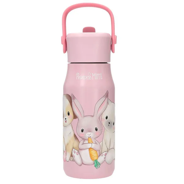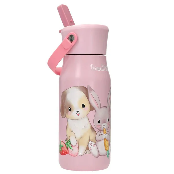 Princess Mimi Gourde en acier inoxydableCette adorable gourde rose en acier inoxydable de Princess Mimi est ornée d’un trio d’animaux mignons accompagnés de fruits et légumes. Le couvercle comporte un bec verseur rabattable relié à une paille à l’intérieur de la gourde. La gourde peut contenir environ 400 ml de boisson froide non gazeuse, qu’elle garde fraîches pendant environ six heures grâce à une isolation sous vide. Matière de la gourde : acier inoxydable ; matière du goulot : plastique (sans BPA et sans plastifiants)