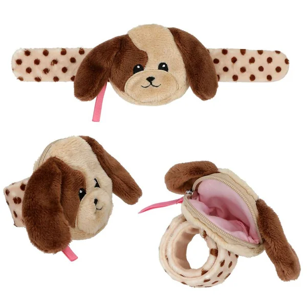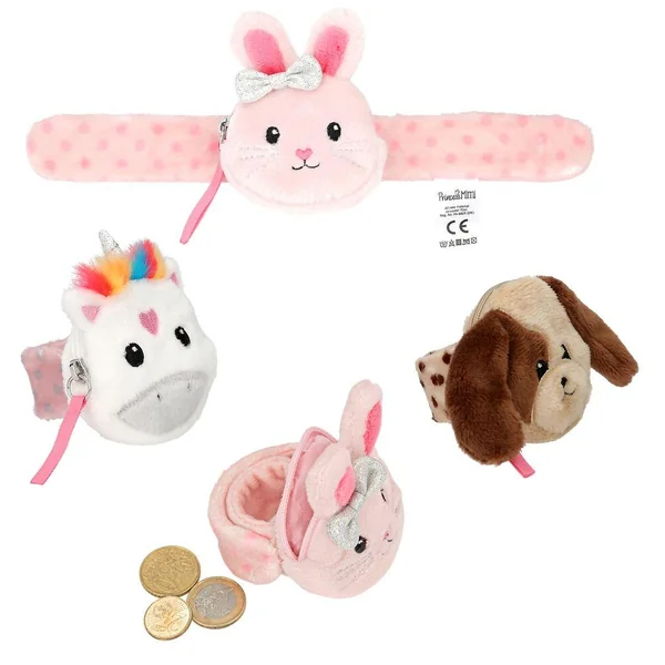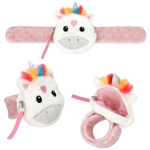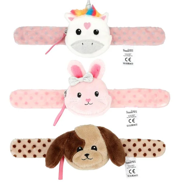 Princesse Mimi Bracelet porte-monnaie Klipp KlappMagique et pratique : ce bracelet à claquer douillet et stylé s’enroule autour de ton bras quand tu le tapes légèrement sur ton poignet. La tête d’animal en peluche cache un porte-monnaie avec fermeture éclair à son intérieur. Disponible en trois versions : lapin rose sur bracelet rose à pois rose vif, chien tacheté de brun sur bracelet marron clair à pois marron foncé et licorne blanche sur un bracelet rose à pois gris. Matière principale : 100 % polyester.