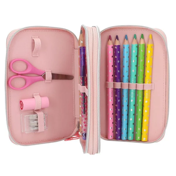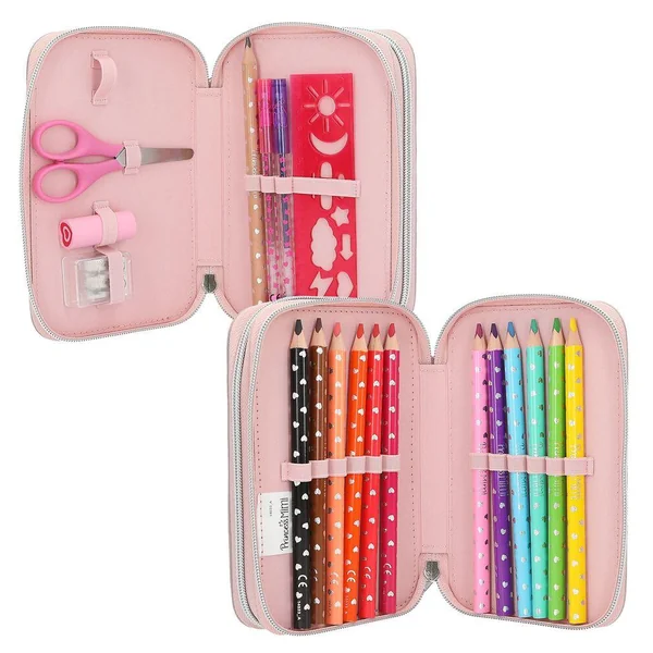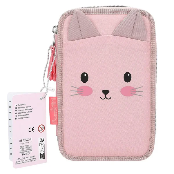 Princesse MimiTrousse à crayons biche Le devant de cette trousse rose avec son design chat est orné d’adorables petites oreilles appliqués et d’un mignon visage de chat. Les deux compartiments séparés sont remplis d’un taille-crayon, d’une règle, d’une gomme, d’un bâton de collet, de ciseaux, ainsi que de 12 crayons de couleur épais, de 2 stylos gel pailleté et d’un crayon à papier épais. De Princess Mimi. Matière principale : 100 % polyester-