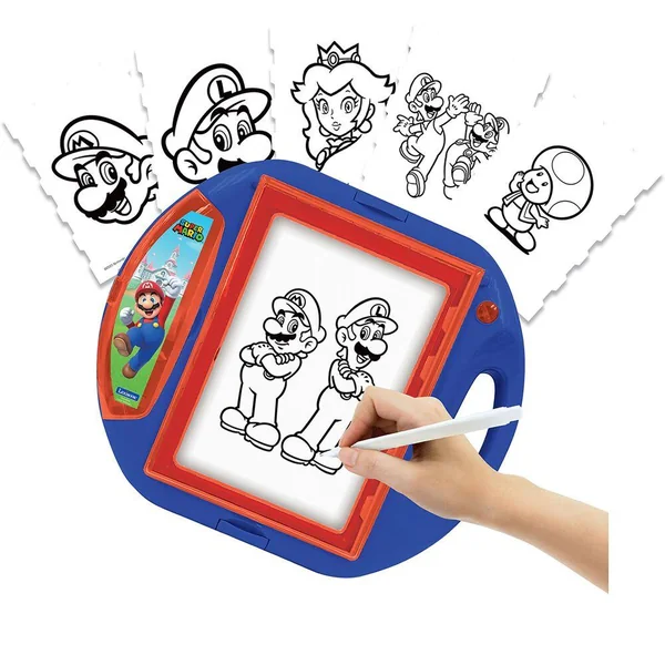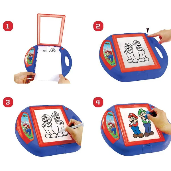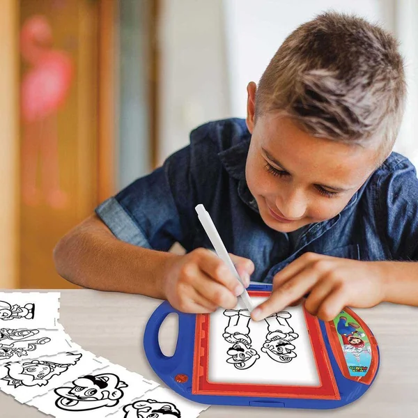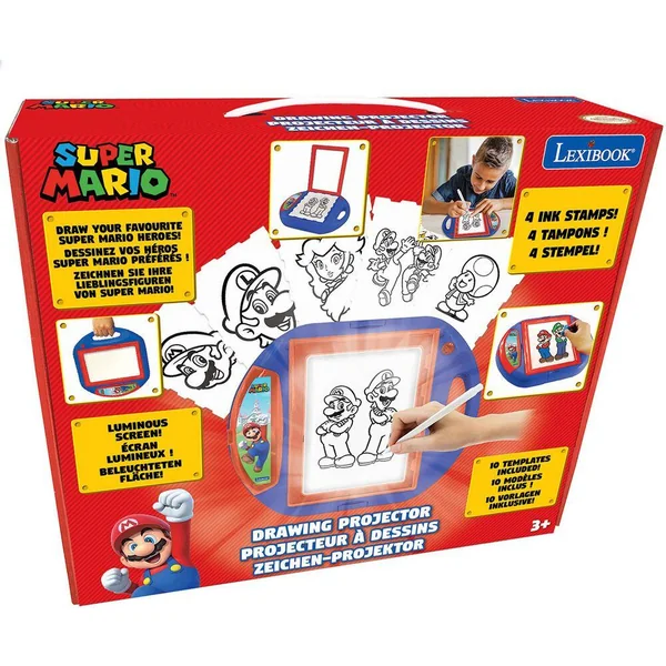 Un fantastique projecteur de dessin avec un écran format A5, 10 gabarits et 4 tampons inspirés de l’univers de Super Mario, pour apprendre à dessiner en s’amusant. Très facile à utiliser grâce à son écran lumineux et à son installation pratique, ce projecteur s’ouvre pour ranger tous les accessoires, et le transporter partout. Un fantastique projecteur de dessin pour dessiner ses héros préférés ! Facile à utiliser : l’enfant n’a qu’à insérer un modèle sous le couvercle en plastique, poser une feuille de papier dessus, fermer le couvercle et dessiner. Écran rétroéclairé : L’écran de taille A5 s’allume pour montrer le modèle sous la feuille de papier et guider l’enfant pendant le dessin. 10 modèles transparents avec les personnages de Super Mario pour dessiner encore et encore. 4 tampons encreurs sont inclus pour dessiner des formes de l’univers Super Mario ! Le projecteur s’ouvre pour ranger tous les accessoires et le transporter partout ! Inclus dans la boîte : 1 projec projec