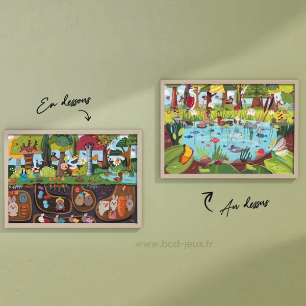 2 puzzles de 24 pièces sur la vie sous terre et dans la mare accompagnés de leur poster à taille réelle.