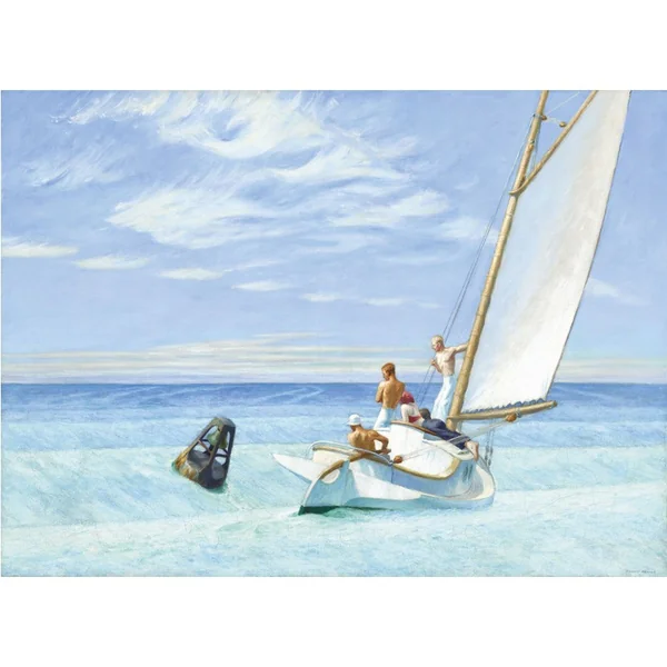 Surtout connu pour ses scènes d’intérieurs et ses personnages solitaires, l’artiste américain Edward Hopper a développé dès l’enfance un grand intérêt pour la mer. Dans cette scène nautique, lumineuse et sereine au premier abord, tous les regards des personnages se tournent vers une bouée à cloche qui semble annoncer un danger imminent.