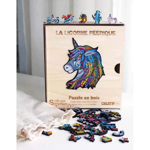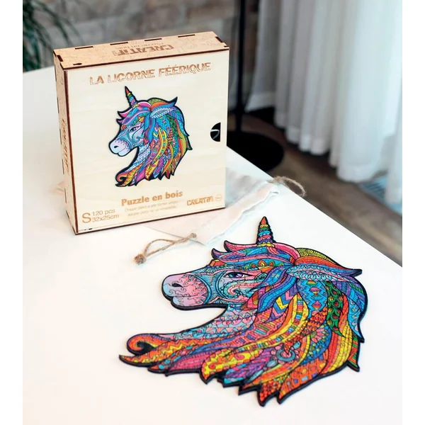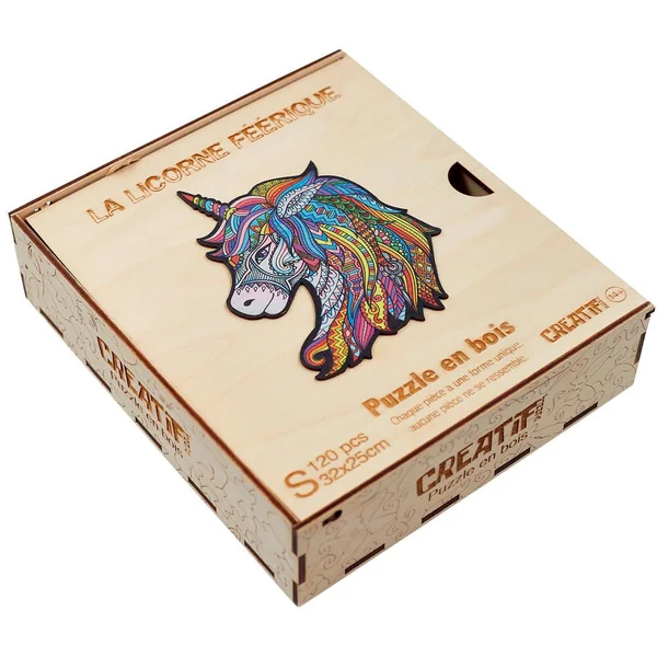 Puzzle en bois de 120 pièces. Taille S. Puzzle en bois La Licorne Féérique est un membre à part des contes de fées. Symbole de pureté et de grâce, elle est prête à partager ses secrets avec vous. Il vous suffit donc pour cela de l’assembler complètement. Lors du montage de ce puzzle unique, vous découvrirez son univers fantasy. Chaque pièce du puzzle le révèle au fur et à mesure. Vous trouverez des figures du monde merveilleux auquel la Licorne Féérique prend pleinement part. Notre Licorne Féérique vous permettra de passer du temps intéressant et amusant avec toute la famille. Les moments de complicités seront ainsi au rendez-vous. Son aspect décoratif ne vous laissera pas indifférent ! Un sac en coton est inclus pour le rangement des pièces. Le puzzle lui-même est fait de contreplaqué de bois de 4 mm d’épaisseur découpé à l’aide d’un laser de haute précision. Cela garantit que toutes les pièces s’emboîtent parfaitement. Chaque pièce est agréable à tenir entre vos mains. L’arôme du bois naturel créera une magie particulière lors de l’assemblage du puzzle. Même après un certain temps, le puzzle ne perd pas ses couleurs et conserve son aspect d’origine. Le puzzle est emballé dans un coffret en bois pour un cadeau encore plus exceptionnel ! Dimensions : du puzzle assemblé 32 x 25 x 0.4 cm, du coffret 20.5 x 18.8 x 5.4 cm.