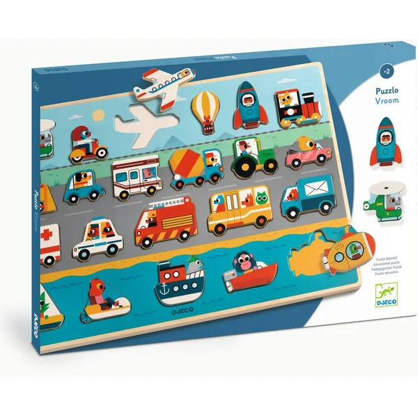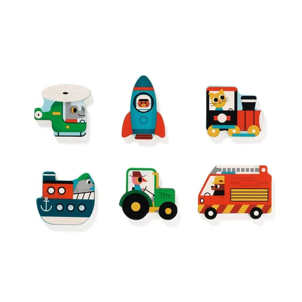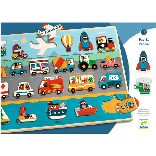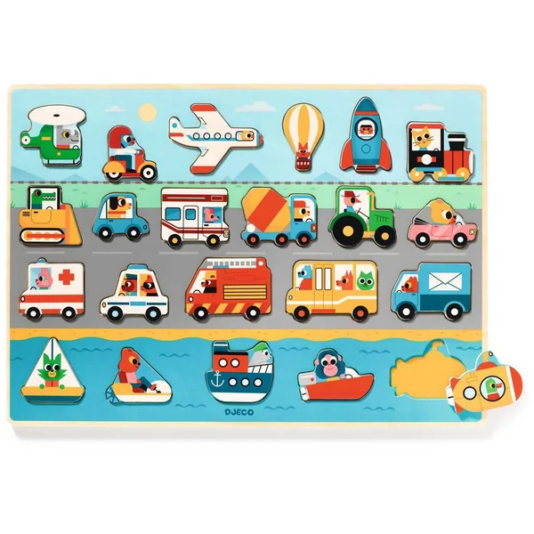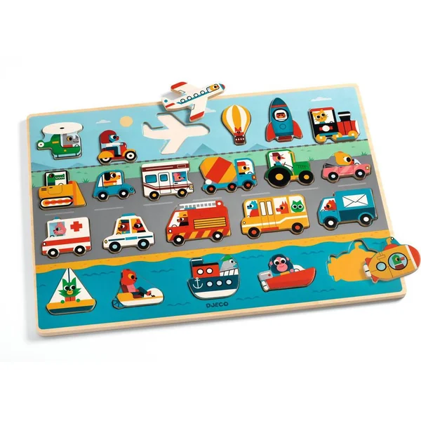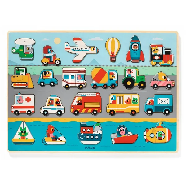 Un puzzle en bois sur le thème des véhicules. L’enfant place les 22 pièces en reconnaissant sur le plateau les silhouettes des véhicules.
