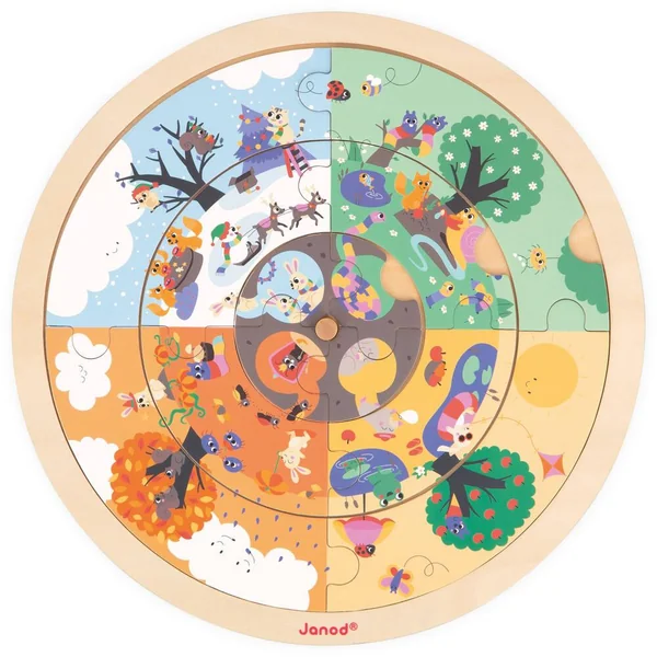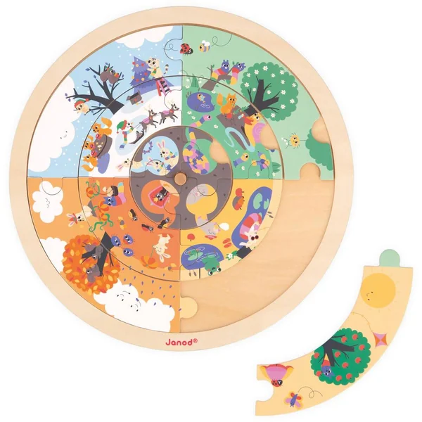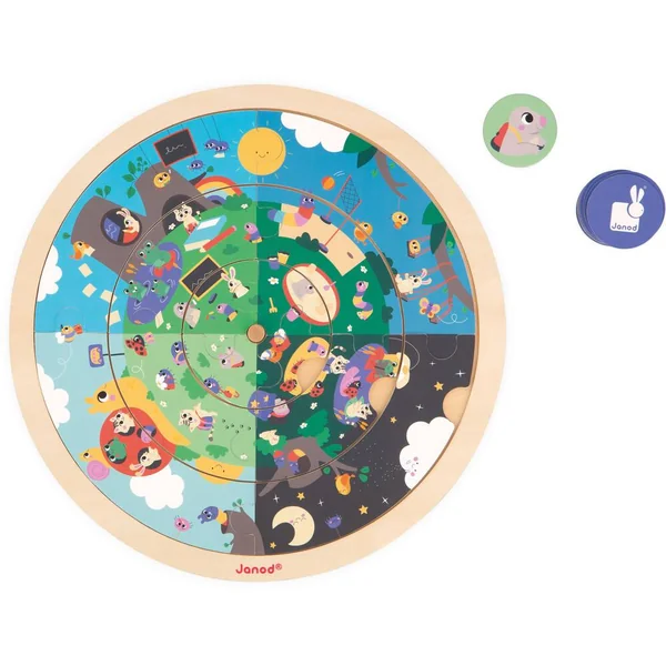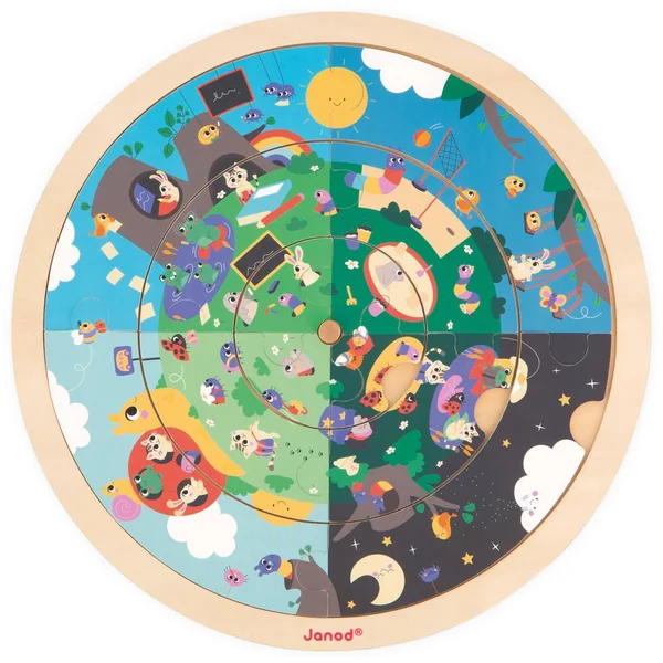 Bienvenue dans le jardin ! Découvre le déroulement d’une journée et apprend les saisons en observant les animaux et leur environnement. Ce puzzle recto-verso permettra à votre enfant de développer sa concentration et son sens de l’observation tout en s’amusant. Le jeu se compose d’un support, 12 pièces de puzzle en bois, 20 cartes et 1 cache en carton. Ce puzzle aborde le déroulement d’une journée au recto et les saisons au verso. Une fois le puzzle reconstitué, votre enfant pourra faire tourner les différents cercles afin de faire correspondre les 4 saisons ou les 4 moments de la journée. Parfait pour apprendre en s’amusant ! Le jeu se poursuit également avec une activité de Cherche et trouve à l’aide du cache. Doté de 3 ouvertures, il suffit de le faire tourner sur le puzzle pour tenter de retrouver les éléments illustrés sur les cartes. La couleur au dos des cartes indique sur quel puzzle l’élément est à retrouver. Pratique ! Jeu en bois et en carton FSCTM. Jeu éducatif développé en collaboration avec une professeure des écoles pour les enfants à partir de 4 ans.