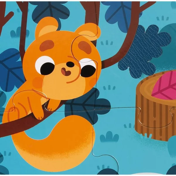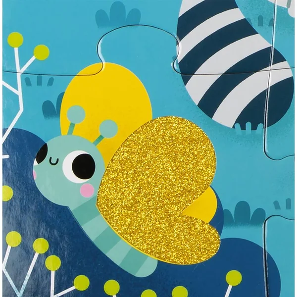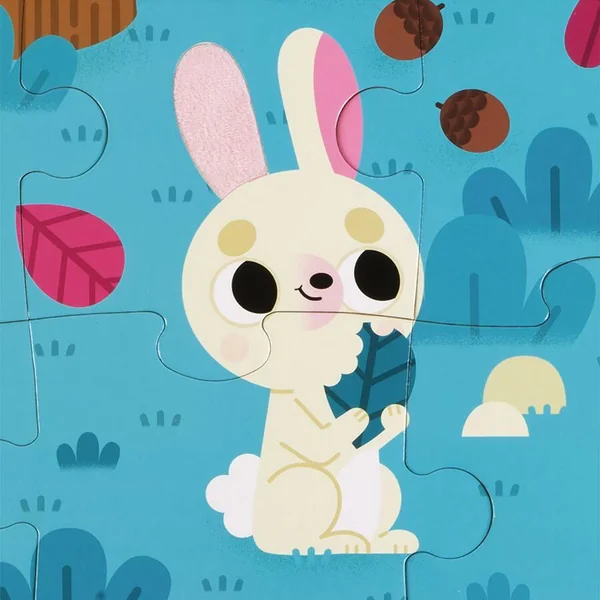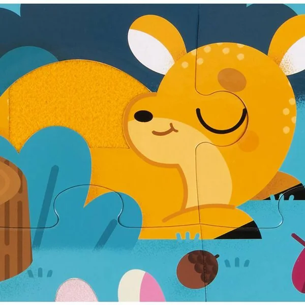 Puzzle géant de 20 pièces en carton rigide, avec 7 pièces texturées (pelage pour le renard, l’ours, la biche, le lapin, imitation plume pour la chouette, effet pailleté pour l’aile du papillon, effet texturé pour les feuilles). Illustration aux couleurs vives sur le thème des animaux de la forêt. Poster inclus.