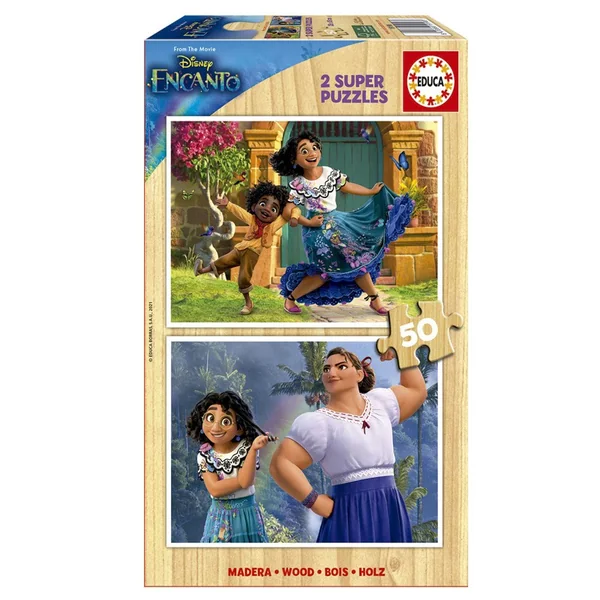 2 puzzles de 50 pièces haute qualité en bois, aux couleurs de Encanto, des célèbres studios Disney Pixar. De grandes pièces en bois, parfaitement finies, faciles r manipuler et r assembler. Des images plus attractives aux couleurs brillantes, rehaussées par une couche de vernis.
