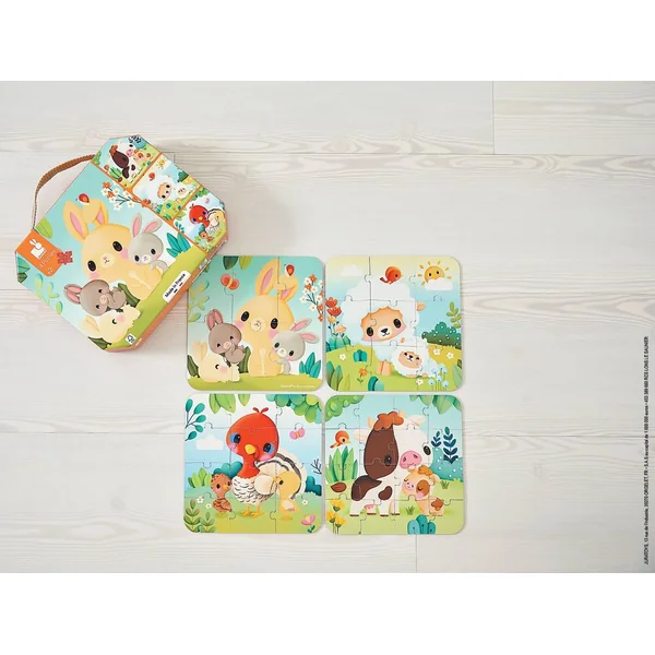 Quoi de mieux qu’une balade à la campagne pour observer les animaux de la ferme et leurs petits ? A travers ces 4 puzzles évolutifs, votre enfant pourra recomposer différentes scènes illustrant un lapin et ses lapereaux, un mouton et son agneau, une vache et son veau, ainsi qu’un dindon et ses dindonneaux. Les puzzles disposent d’un nombre de pièces évolutif afin d’accompagner l’enfant dans sa progression. Ainsi, il pourra commencer par un puzzle de 6 pièces, puis un puzzle de 9 pièces. Une fois que votre enfant se sentira à l’aise avec ces deux premiers puzzles, il pourra poursuivre avec les puzzles de 12 et 16 pièces. Pratique, le dos de chaque puzzle est d’une couleur différente pour aider l’enfant à retrouver les bonnes pièces ! Puzzles évolutifs de 6, 9, 12 et 16 pièces fabriqués en France, certifiés FSCTM et à base d’encre végétale.