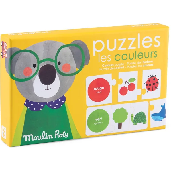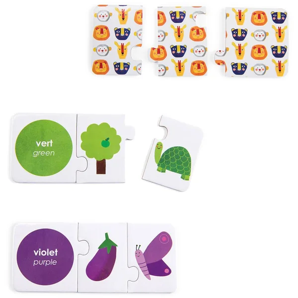 8 puzzles illustrés en carton épais, pour apprendre les couleurs de manière ludique, comprenant 3 pièces chacun. L’enfant doit associer à la couleur, l’animal et l’élément de la nature qui correspondent.