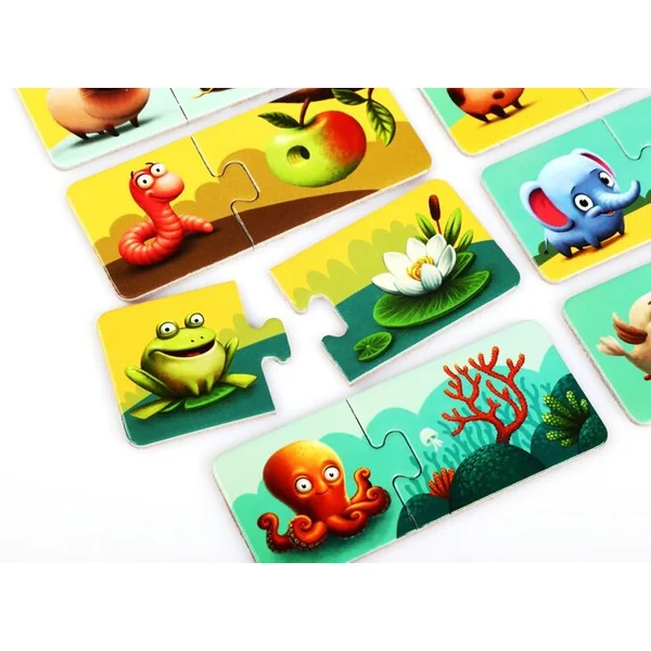 Dans la boîte, vous trouverez 20 grands puzzles solides, formant 10 paires de cartes distinctes qui sont thématiquement liées. Une moitié des cartes contient des illustrations des différents animaux et l’autre moitié des cartes montre leurs habitats les plus courants.