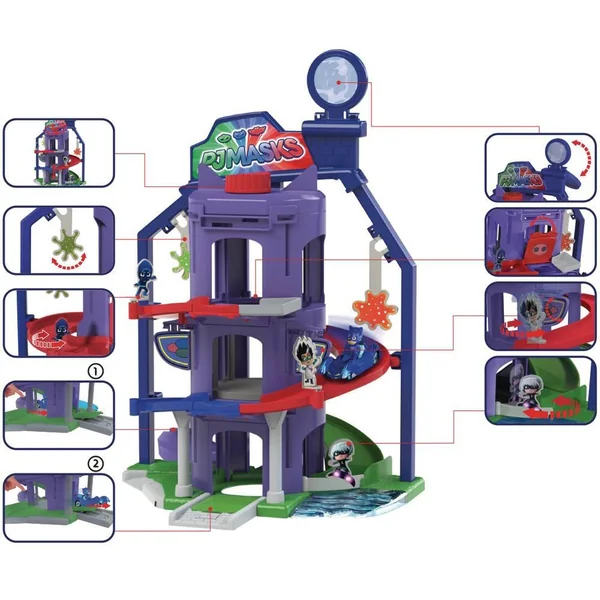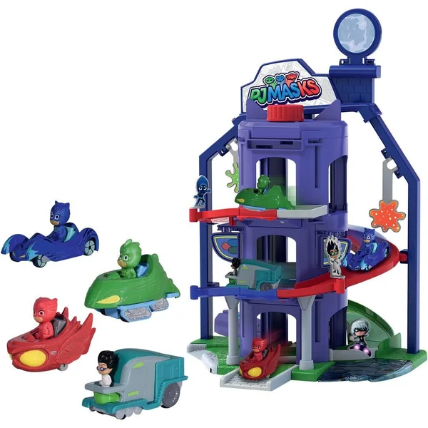 Plonge dans l’univers de tes héros préférés avec le quartier Général des personnages du dessin animé et différentes fonctions de jeu : 1 lanceur, 1 ascenseur, 1 saut. Contient 4 véhicules en métal avec figurines inclus : Cat-Car, Gekko-Mobile, Owlette-Glider, Romeos-Lab.