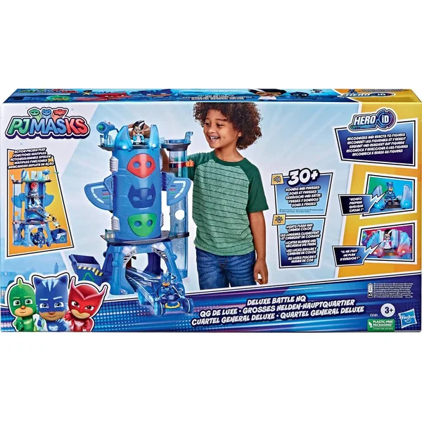 Pyjamasques, c’est l’heure d’être un vrai héros ! Le QG de luxe des Pyjamasques contient des tonnes de super fonctions qui captiveront l’imagination des enfants d’âge préscolaire. Équipé de la technologie Hero ID incroyable de Hasbro, ce QG de luxe identifie les figurines Pyjamasques de 7,5 cm compatibles avec Hero ID en tant que héros ou méchant, et active des sons et lumières propres aux personnages Yoyo, Roméo, Bibou et Gluglu (figurines Yoyo et Roméo incluses ; autres figurines vendues séparément, dans la limite des stocks). Les enfants vont aimer piéger les méchants, les imaginer s’échapper par la sortie secrète, lancer des projectiles avec le blaster et élancer le Chat-Bolide avec le lance-véhicule ! Des figurines Yoyo et Roméo pour imaginer de super aventures entre héros et méchants ! Ce coffret Pyjamasques est un super cadeau pour les enfants qui aiment les aventures de superhéros de Yoyo, Bibou, Gluglu avec tous leurs amis et ennemis