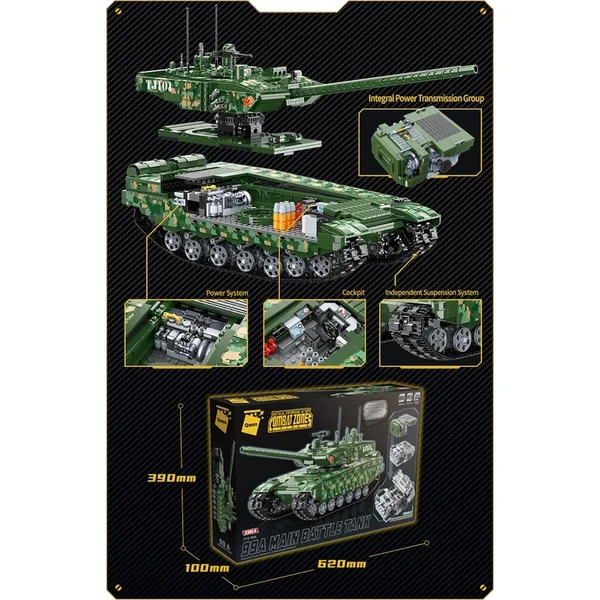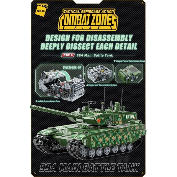 La reproduction détaillée du char chinois A99 et de son groupe motopropulseur représente un défi pour les constructeurs expérimentés. Le char offre un intérieur élaboré et facilement accessible, comprenant également un modèle simplifié de l’unité motrice à combustion. Le châssis du char est équipé d’essieux indépendamment suspendus et sa tourelle est bien sûr entièrement rotative. Une caractéristique particulière du kit est un grand modèle de l’unité motrice 150HB-2, soigneusement détaillé et mécaniquement attrayant, qui permet d’examiner ou d’exposer les détails de sa construction. Les kits hautement variables Qman en blocs plastiques colorés peuvent être combinés avec des kits similaires de nombreux autres fabricants importants. Fabriqué en plastique ABS de haute qualité, non toxique et durable. Emballé dans une boîte en papier imprimée de manière colorée.