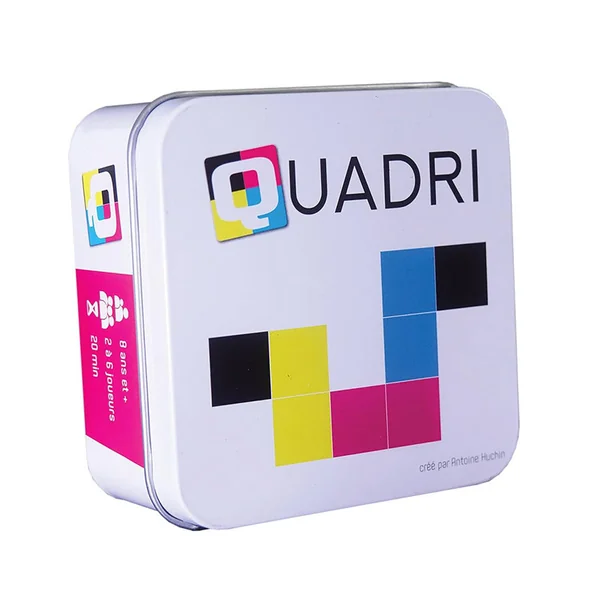 Quadri, créé par Antoine Huchin et édité par Creative and Cool, est un jeu de placement de cartes où chaque carte comporte 4 couleurs. Le but est de réaliser des objectifs de forme et de couleur pour marquer un maximum de points. Le jeu propose 3 modes distincts : compétitif, collaboratif et ball trap, chacun offrant une expérience différente.