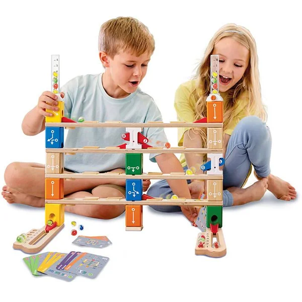 Apprends les bases du codage avec cet amusant coffret de circuits de billes Quadrilla ! Construis les tours et les pistes et trouve les blocs manquants pour déverrouiller le code ! Les défis sont infinis avec ce parcours de billes de codage hors écran ! Une fois que tu as tout installé, tu peux relever les défis sur les 30 cartes incluses et faire rouler tes billes ! Comprend 18 blocs, deux trappes à trous, un distributeur de billes, 10 accélérateurs, trois anneaux d’escalade, 4 anneaux d’escalade en plastique, une bascule bleue, une bascule rouge, 40 billes, un sac en coton, deux collecteurs de billes, 4 longues pistes droites et 30 cartes de défi. Ce jeu est une excellente introduction interactive aux principes du codage et est également idéal pour encourager la pensée logique.