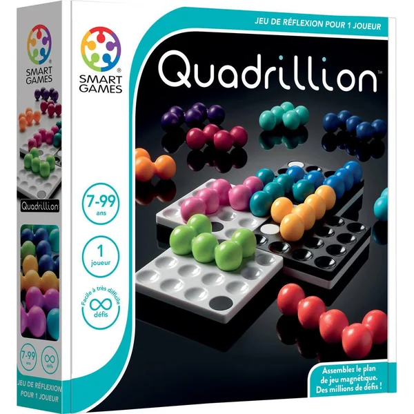 Les règles du jeu sont faciles. Premièrement, il faut relier les 4 grilles magnétiques pour constituer ton plateau. Ensuite, il faut parvenir à y placer les douze pièces de couleur sans toucher les points noirs et blancs. Le but du jeu est de parvenir à trouver une solution au défi. Alors, remue tes méninges et teste les assemblages par millions que propose Quadrillion. Pour t’entraîner, tu pourras te servir des 80 défis présents dans le livret avec leurs solutions.