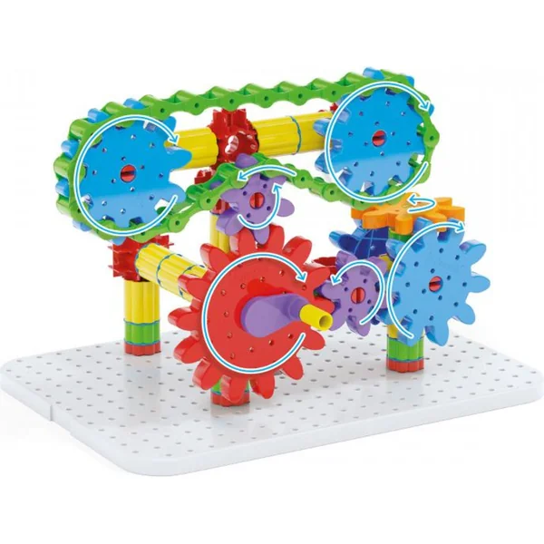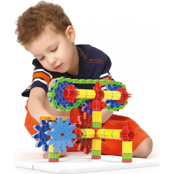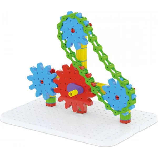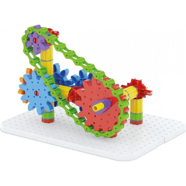 La plaque de base solide permet de construire des systèmes de transmission horizontaux et verticaux, tant selon un guide illustré clair que sur la base d’idées et de fantaisies personnelles. Les enfants de 5 à 10 ans, grâce à ce jouet incassable et sûr, exercent et développent leur motricité fine, leur pensée logique et mathématique ainsi que leur capacité à résoudre des problèmes, apprennent à travailler avec l’erreur et découvrent de manière ludique les principes de la mécanique.