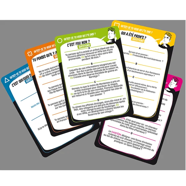 • C’est fou non ? : La carte contient deux affirmations. Le joueur doit trouver laquelle est vraie. Exemple : Tu penses qu’il a existé un enfant élevé par des faucons pèlerins retrouvé en 1976 lors d’une promenade ou qu’un coq a vécu sans tête pendant 18 mois ?