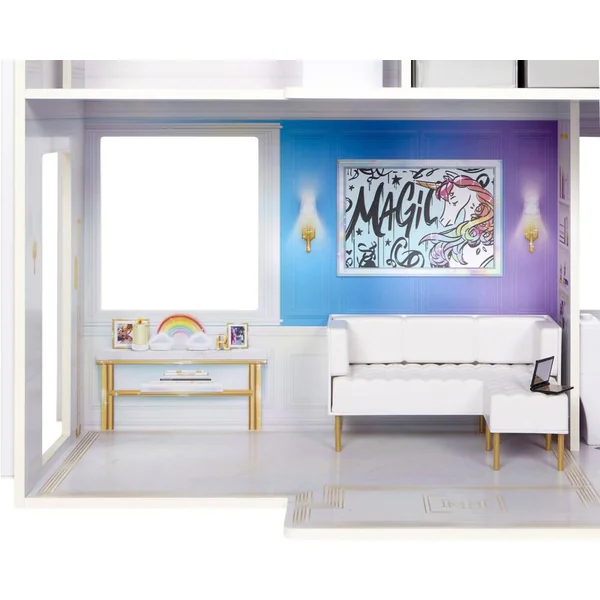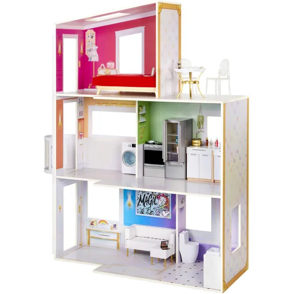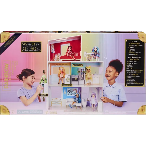 Rainbow High Townhouse est une maison de poupée en bois à trois étages qui inspire la créativité. Cette maison moderne, colorée et entièrement meublée, est l’endroit où vos poupées mannequins Rainbow High peuvent vivre et réaliser tous leurs rêves créatifs.Par MGA Entertainment, les créateurs des poupées mannequins de collection L.O.L. Surprise, des poupées mannequins Rainbow High, des poupées Na Na Na Surprise, des poupées mannequins Bratz, des MGA’s DreamElla, MGA’s Glitter Babyz, Lalaloopsy, poupons et objets de collection Baby Born Surprise, jouets pour enfants Little Tikes et bien d’autres marques populaires. Grande maison de 114cm de haut avec de nombreux univers de jeu et accessoires –