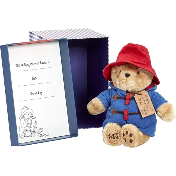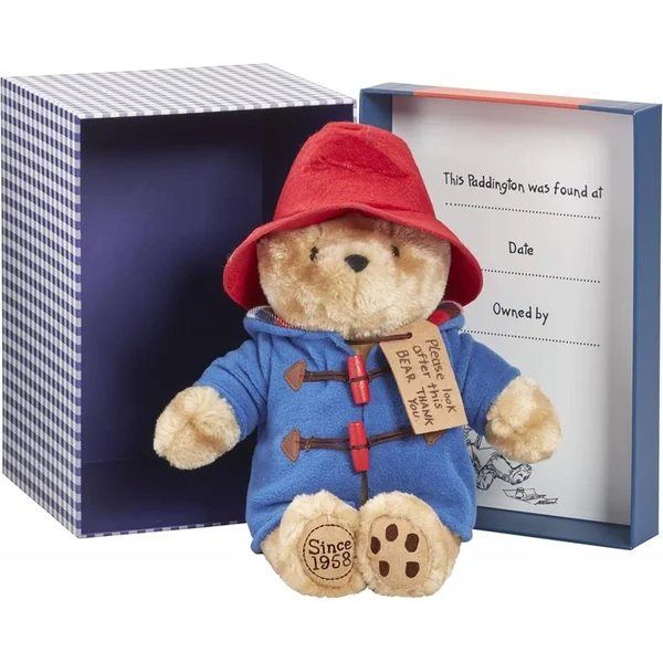 Ce charmant ours en peluche Paddington dans une boîte-cadeau, fabriqué à partir de la peluche la plus douce, attend que vous l’emmeniez chez vous et que vous en preniez soin. Il porte son chapeau rouge sur la tête, est vêtu de son manteau bleu typique avec de véritables boutons et a une étiquette autour du cou remerciant de bien s’occuper de lui.