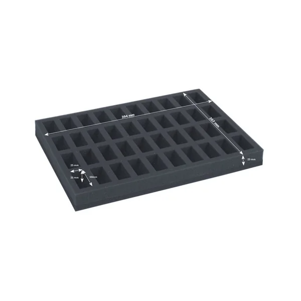 Dimensions du plateau en mousse : 394mm x 267mm x 37mm (espace profond de 25mm + fond en mousse de 12mm d’épaisseur).