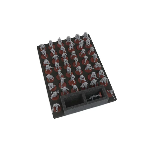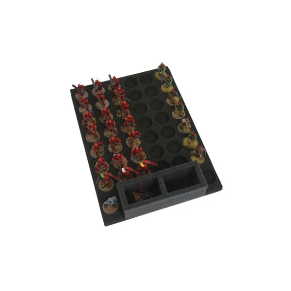 La mousse comporte 42 découpes circulaires de 26 mm de diamètre pour 6 unités de 7 soldats, ainsi que 2 découpes circulaires supplémentaires pour les commandants et 2 emplacements rectangulaires traditionnels.
