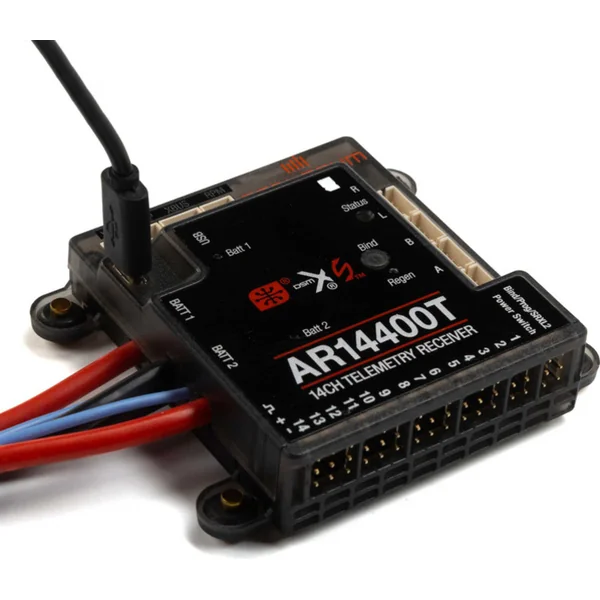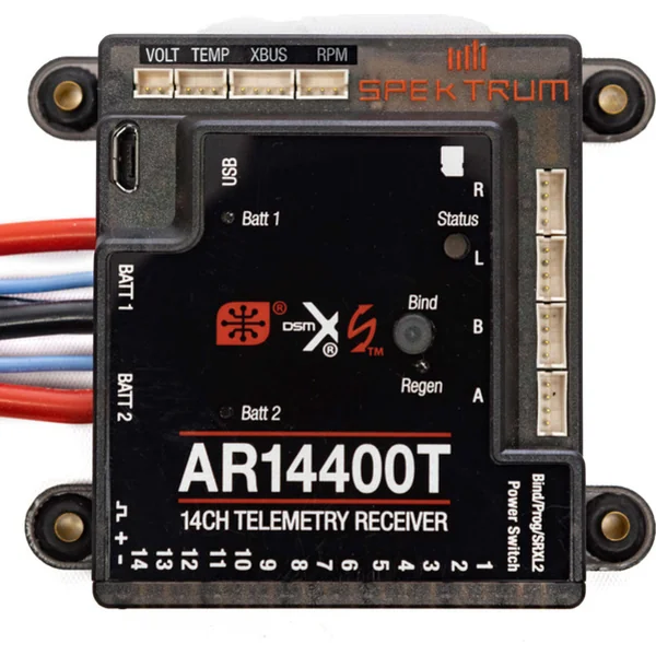Une fonctionnalité révolutionnaire du récepteur AR14400T PowerSafe est les capteurs de puissance de la batterie intégrés au récepteur pour des informations sur la charge et la consommation des servos, du train d’atterrissage rétractable, des lumières, etc. utilisées par chacune des batteries. Le récepteur dispose de ports pour les tours, la tension des batteries de vol et les capteurs de température, ainsi qu’un port X-Bus pour d’autres télémétries externes.