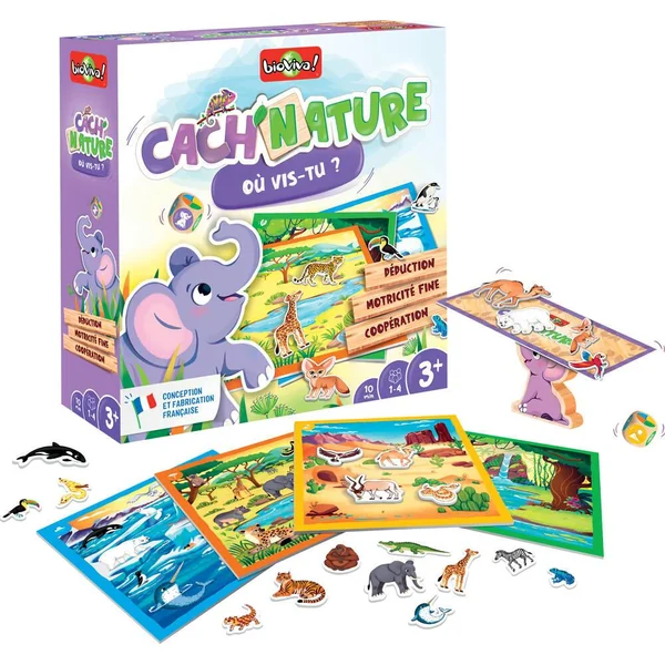 Où vas-tu ? Lance le dé et replace les animaux dans leurs milieux naturels. Attention chaque animal mal placé est déposé sur le plateau à bascule. Ne le fais pas tomber et c’est gagné ! Contenu : 4 plateaux Milieu, 50 formes Animal, 1 pion en bois, 1 plateau à bascule, 1 dé et 1 livret pédagogique. De 1 à 4 joueurs. Dimensions de la boîte : 20 x 6 x 20 cm.