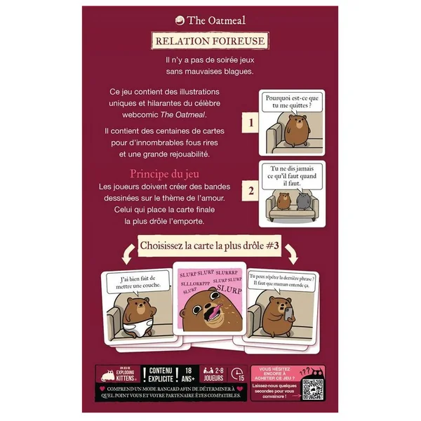 À chaque manche, composez une mini bande dessinée à partir de cartes illustrées déjantées et créez la chute la plus drôle (ou la plus trash). Votre mission ? Convaincre le juge que votre fin est la meilleure. Situations absurdes, dialogues douteux et rebondissements explosifs : chaque carte, signée The Oatmeal, déborde d’un humour visuel sans filtre.