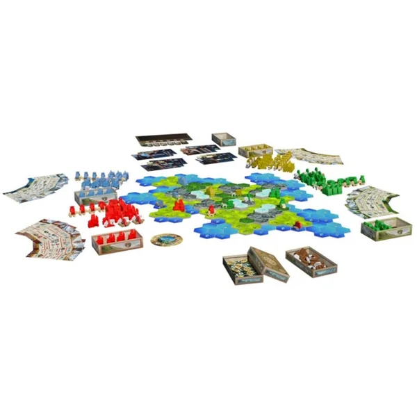 Chaque joueur commence avec un petit peuple comprenant une Ville, un Nomade et un Navire, et évolue vers une civilisation complète avec des Temples, des Marchands et les précieux Montagnards, capables de franchir ces falaises impressionnantes.