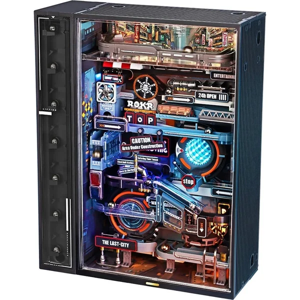 La piste à billes avec élévateur automatique mesure 187 cm de long, dispose d’un éclairage néon dynamique et est équipée d’un moteur efficace avec un couple élevé. Ce panorama miniature d’une grande ville animée est conçu dans les moindres détails avec un accent sur l’aspect visuel. Les billes parcourent une piste inspirée du steampunk industriel à une vitesse folle, dans le décor de la ville entre les bâtiments, les tuyaux et les usines, accompagnées de flashes de néon.