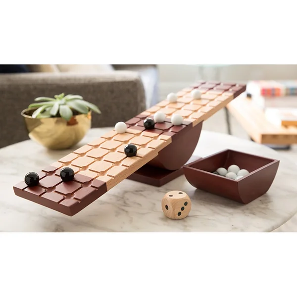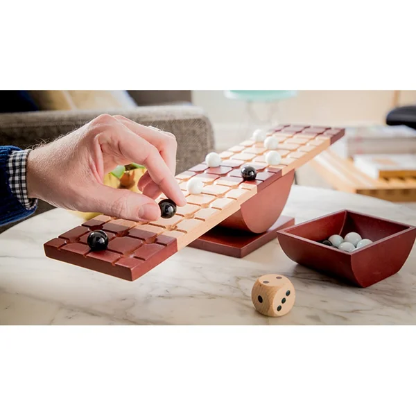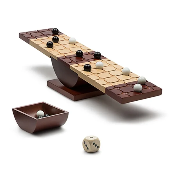 Combinant stratégie, habileté et un peu de chance, le jeu se résume en une planche de bois qui bascule comme un balancier, un dé spécial et 28 billes.