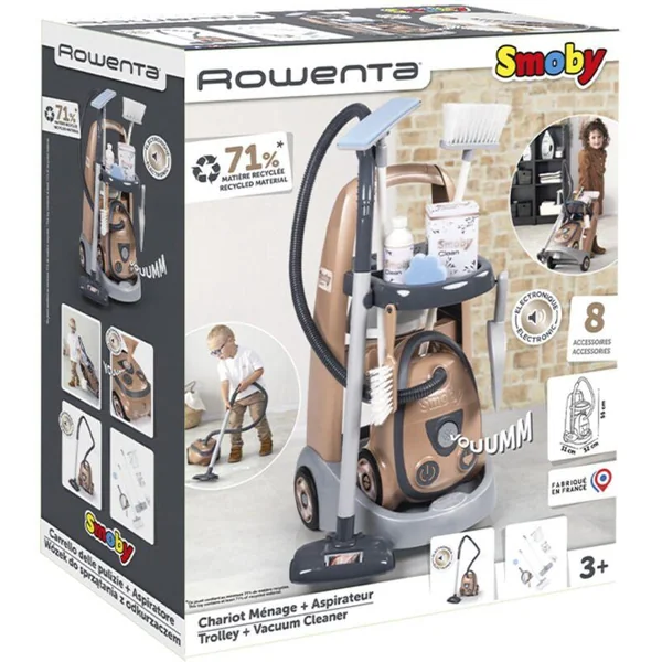 Chariot ménage avec de nombreux accessoires inclus : 1 balai, 1 balayette, 1 pelle, 1 balai serpillère, 1 bouteille, 1 boite factice, 1 éponge fleur, 1 seau + 1 aspirateur traineau Rowenta.