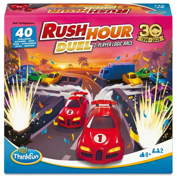 Rush Hour® Duel ThinkFun : le jeu de logique légendaire ! Dans cette version, en plus de sortir la voiture rouge de l’embouteillage en déplaçant stratégiquement les autres véhicules, vous devez le faire plus rapidement que votre adversaire. 40 défis évolutifs du niveau débutant à expert permettent une progression naturelle.