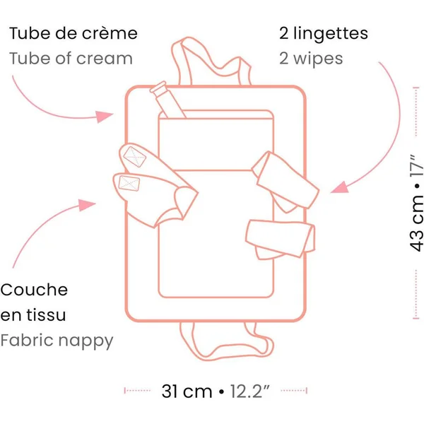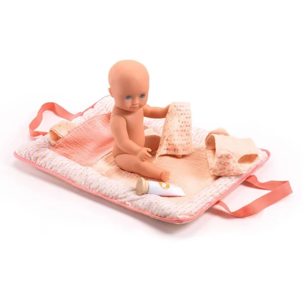 Un sac à langer transportable pour faire la toilette de son poupon. Une fois ouvert, il se trransforme en un matelas confortale pour allonger le bébé. Avec la couche, les lingettes et le tube de crème, bébé aura les fesses toutes propres. Un accessoire indispensable à emporter partout !