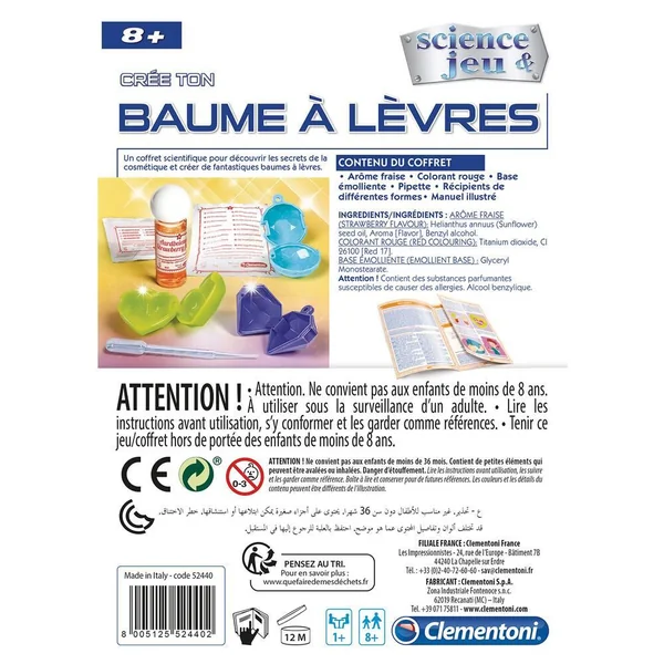 Un véritable coffret scientifique pour découvrir les secrets de la cosmétique et créer de fantastiques baumes à lèvres. Le coffret comprend une base de cire émolliente, un colorant en poudre et un délicieux arôme de fraise pour te permettre de créer un baume à lèvres doux et parfumé. Le coffret comprend également un mini verre doseur, une spatule et des pots pour t’aider à réaliser tes créations cosmétiques que tu pourras ensuite offrir. Les créations proposées sont faciles à réaliser grâce au manuel illustré. Contient 1 arôme fraise + 1 colorant rouge + 1 base émolliente + 1 pipiette + 3 récipients + 1 manuel illustré-