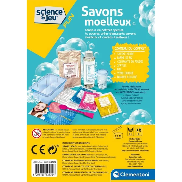 La science des savons devient amusante avec ce nouveau coffret pour devenir expert en cosmétique ! Le coffret contient tous les ingrédients et instruments nécessaires, y compris la spatule, les paillettes et les colorants pour créer des savons doux de différentes formes en quelques gestes simples ! Crée de nombreux savons différents en suivant les instructions contenues dans le manuel illustré… l’imagination n’a pas de limite !