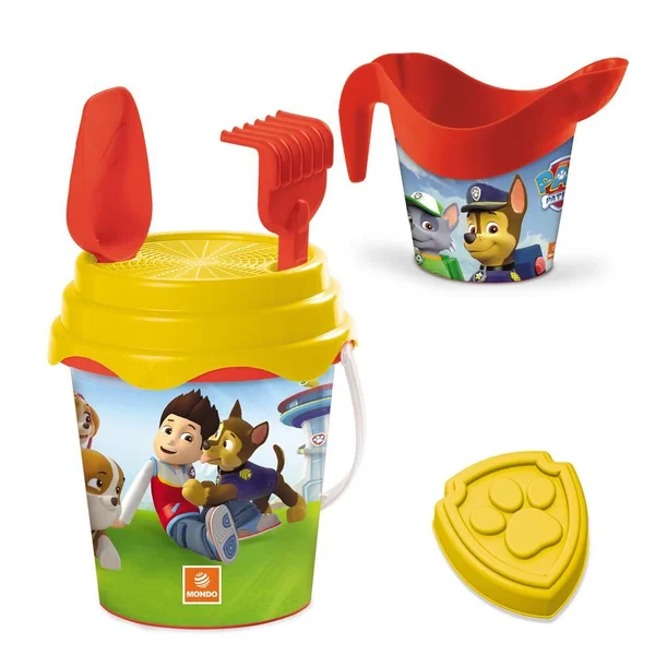 Idéal pour s’amuser à la plage. Seau Pat’Patrouille de 17 cm de diamètre, garni avec une pelle, un râteau, un moule, un tamis et un arrosoir.