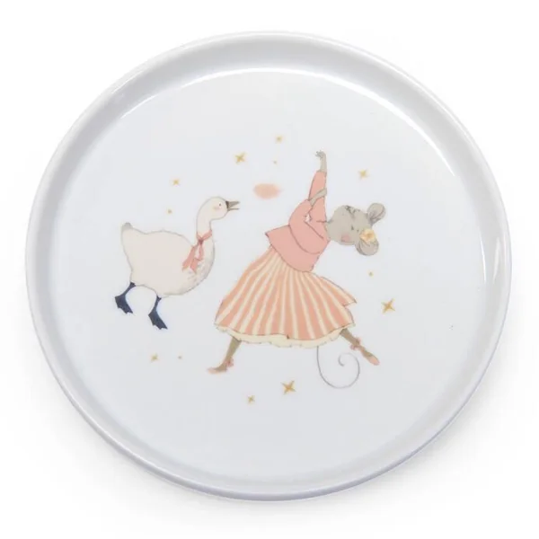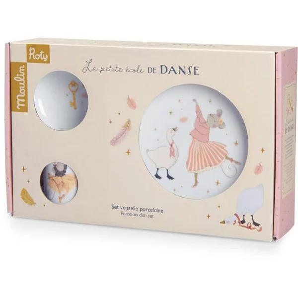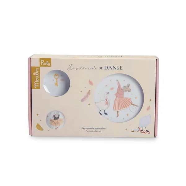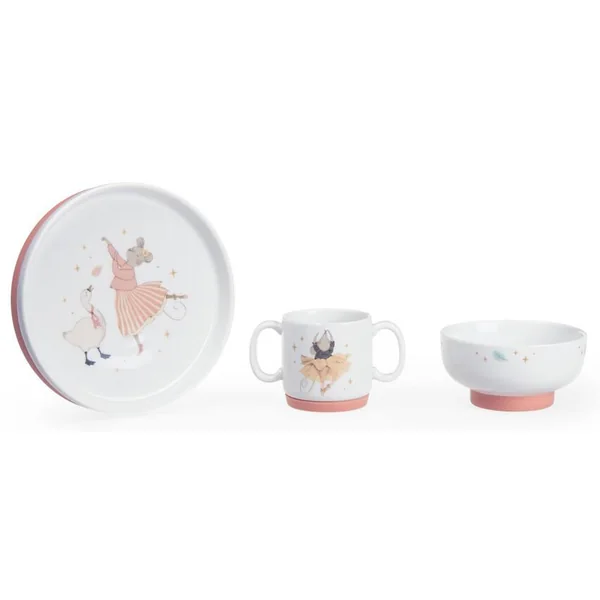 Coffret vaisselle en porcelaine, tendrement illustré pour manger comme les grands. Comprend bol, tasse à anses et assiette avec chaussette antidérapante en silicone amovible qui adhère sur les surfaces lisses et empêche de glisser ! Passe au lave-vaiselle